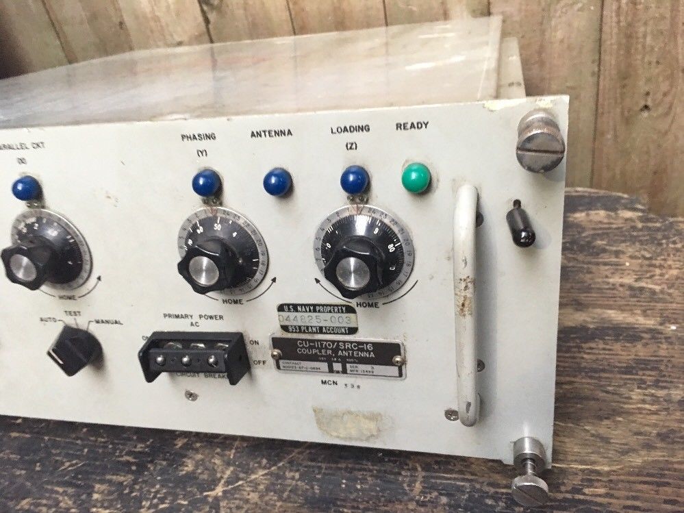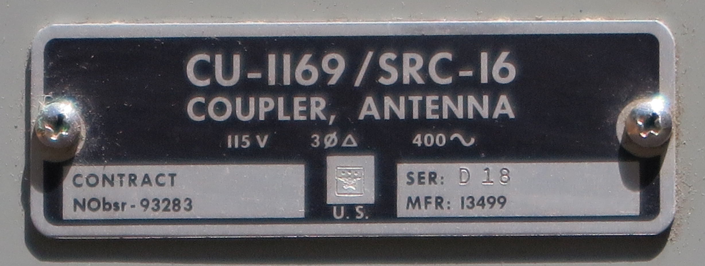 1kw (2kw PEP) per input | components - AN/SRA-56 (2-6mc) four CU-1772/SRA-56 coupler units PP-4993/SRA power supply CV-6422/SRA-56 cabinet CU-1773/SRA-56 matching network (to add four more coupler units) AN/SRA-57 (4-12mc) four CU-1774/SRA-57 coupler units PP-4993/SRA power supply CV-6422/SRA-57 cabinet CU-1773/SRA-57 matching network (to add four more coupler units) AN/SRA-58 (10-30mc) four CU-1776/SRA-58 coupler units PP-4993/SRA power supply CV-6422/SRA-58 cabinet Manuals available from Fair Radio Sales need more info!! - see also tuner section of Shipboard Equipment Manual |