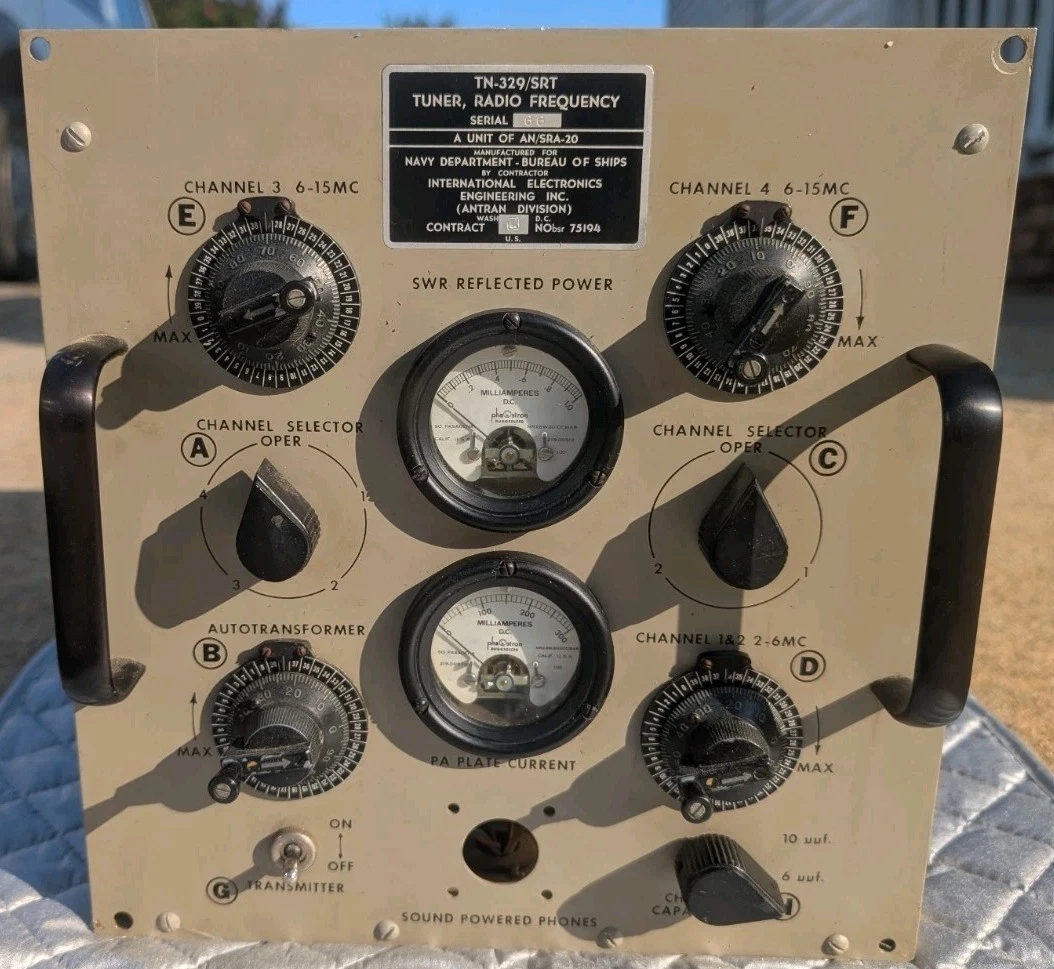 In addition, the tuner contains a SWR meter, a transmitter plate current meter, a transmitter keying switch, and a sound-powered telephone receptacle which is used in the antenna tuning process. The field change kit also contains a plate current meter for installation in the SSB-1 equipment.