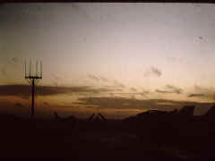 Info from a Ticonderoga ET - "The pickle fork was a multiple whip MHF antenna... It had, if I remember correctly, eight whips on a platform about 10 feet across and mounted on a single pole which could be tilted seaward when launching and recovering aircraft... The whips were all attached to a netting of copper cables which surrounded the base of the platform and electrically lengthened the antennas ..It was fed by ten tuners which were a combination of capacitance and inductance in series and parallel to the antenna, and would also electrically lengthen and shorten the antenna in an attempt to reach the point of resonance..... The radio men would attempt to tune it to a SWR of 1:1 for maximum power out...`the advantage was that if the frequencies had enough split between them, we could put ten transmitters up on a single antenna.." |
