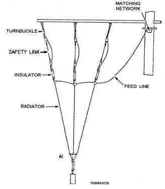 CONICAL MONOPOLE ANTENNA Another broadband antenna used extensively is the conical monopole shown in figure 3-36. Like the sleeve antenna, it is used both ashore and aboard ship. When operating at frequencies near the lower limit of the high-frequency band, the conical radiates in much the same manner as a regular vertical antenna (omnidirectional on the horizontal plane). At the higher frequencies the lower cone section radiates, and the effect of the top section is to push the signal out at a low angle. The low angle of radiation causes the skywave to return to the earth at great distances from the antenna. Hence, the conical monopole antenna is well suited for long distance communication in the high-frequency range. |