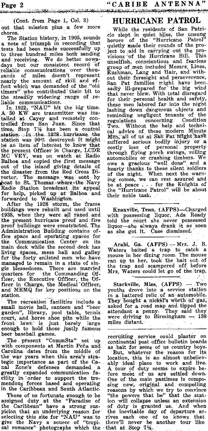 The United States Naval Radio Service in Puerto Rico began with a small wireless telegraph station located at stop 7-1/2 in Puerta de Tierra, facing the Atlantic Ocean on the north and south on the Central Highway, now Constitución Avenue. After the change of sovereignty in 1898 these lands had remained under military rule. In December 1903 Rear Admiral Dunlap installed a three kilowatt transmitter for the purpose of establishing communication with a similar station on Culebra Island and ships on the high seas. This was the first wireless station on the island. This station would link with another to be located in Culebra, as well as with ships on the high seas and with the stations of Guantanamo, Colon, Key West, Santo Domingo, Haiti and San Martin. Its main objective was to provide an efficient and rapid communication system to the Commander-in-Chief of the US fleet and to other government agencies, both civilian and military. It was one of 54 radio stations belonging to the Department of the Navy, and one of 10 of medium power. Wireless communications were by then a novelty. Only six years earlier the first practical transmission, at a distance of five kilometers between the towns of Laverck Point and the island Fratholm, in the Bristol Channel, was achieved by the Italian Guillermo Marconi. At the same time as Marconi patented the radio, Aleksandr Stepanovich Popov independently constructed a device to capture the electrical disturbances of the atmosphere, which would later be known as an antenna. Morse Code was the preferred transmission method during the first half of the 20th century. The first electromagnetic wave detector of the naval station consisted of a rudimentary electromechanical system, which received and printed messages in the form of dots and dashes on a paper tape. NAU was the official call sign for the naval station. In its beginnings, almost all the radio stations had more than two letters, like the telegraph offices of earth. The call that crossed the air to contact the station of San Juan was at the beginning "S A". It was later switched to NAU, following the agreed standard for all radio calls, consisting of three or four letters, or a number and two letters, the last being used by amateur radio stations that began to proliferate in large numbers. Admiral Manney, head of the Naval Equipment Bureau, reached an agreement with Abraham White, president of the American De Forest Wireless Telegraph Company, for the Navy's acquisition of five of the best wireless telegraph circuits in the world for that time. The Navy had the imperative need for a wireless connection between its naval bases at Guantanamo, Culebra and Key West, taking into account that in case of hostilities with a foreign power the submarine cable system would be the first point of attack. The need to protect the Canal Zone aggravated the problem of finding an alternative secondary means of communication, and the general meeting had learned a lesson when Porto Arthur was isolated during the war. Therefore, the Navy Bureau of Equipment began a series of competition tests under the direction of Lieutenant Commander Jayne, and the result was the agreement between Admiral Manney and Mr. White, extending the signing of a contract by the total amount of $58,666 to supply the Government of wireless instruments. The company guaranteed operation and service at these facilities: - Key West to Panama, Puerto Rico to Key West, south coast from Cuba to Panama, Pensacola to Key West and South from Cuba to Puerto Rico. February 1904, the naval department decided to replace the transmitter with one of greater power, and for these purposes it raised three masts of 210 feet of height each one and put into operation a radio device of mark "De Forest," thirty-five kilowatts. The masts supported an antenna three hundred feet long. The power for this facility was supplied by the local electric power company, but it was noted that each time the transmitter came into operation, it caused substantial voltage drops in the company's distribution lines. Therefore, the navy decided to build its own plant; And by December 1905 the station operated with independently generated energy with satisfactory results. The device could communicate with Guantanamo (SI) Colon (SL) and Key West in Florida (RD), its long distance lines connected with those of the Government where telephone and telegraph services were available. After issuing the "Instructions for the Transmission of Messages by Wireless Telegraphy", the Navy Department ordered November 30, 1904, to all naval radio stations on the ground, to transmit promptly all weather reports and storm warnings Issued by the Bureau of Time at designated times. In addition, they were required to transmit hurricane information as soon as the notices were received, as well as at scheduled scheduled times. All US Navy warships equipped with radio had to transmit meteorological observations, addressed to the Bureau of Weather, at least once a day, or more frequent when storm conditions existed. In 1913 the communications equipment was newly renovated by the installation of a 30-kilowatt Federal Telegraph Co. transmitter, which included erection of two 300-foot-tall steel towers at a cost of approximately 17 Thousand dollars, which replaced the three original 210-foot masts. The results were splendid, achieving greater transmission distances and the establishment of communications with Navy ships on the high seas. The technology in communications was advancing at a rapid pace, and as soon as a year had passed and the rotary apparatus of 30 KW became obsolete. As plans were already formulated in 1914 to transfer the operations related to the transmission of signals to the new Naval Radio Station in Cayey, first was tried only to modify the existing transmitter, obtaining some satisfactory results. However, it remained to equip Puerto Rico with a high power radio station. In 1916, the Department of N