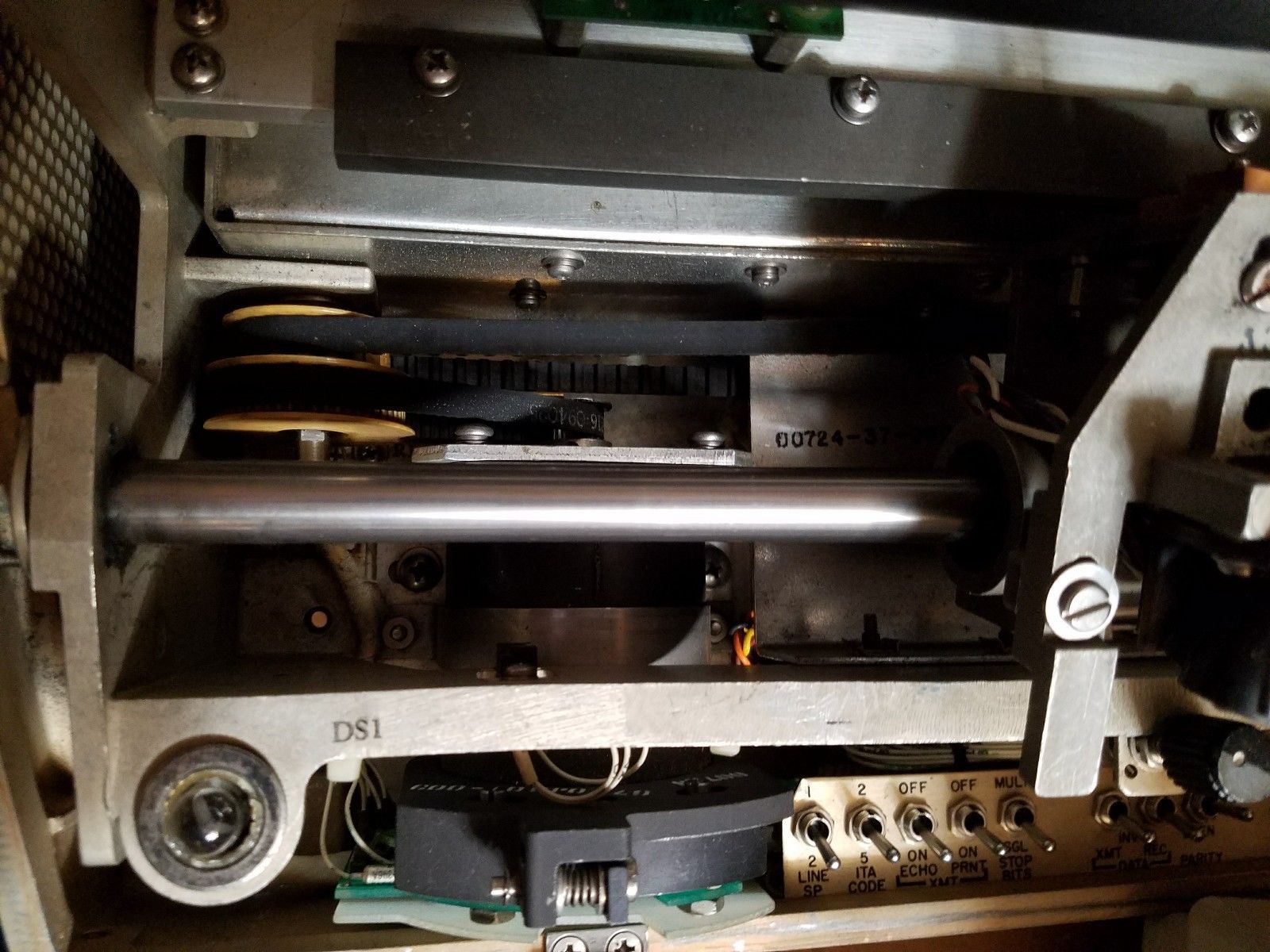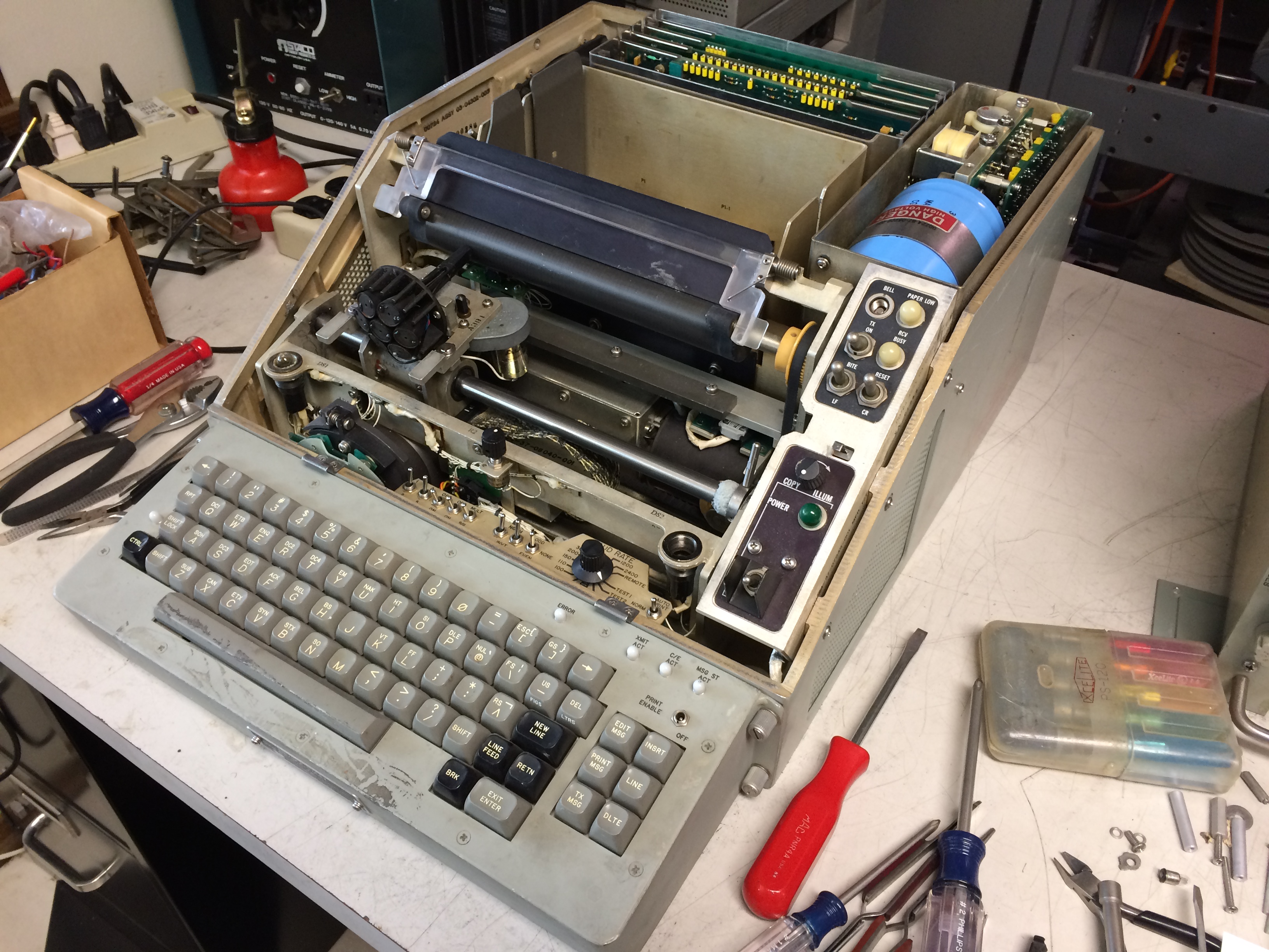 | SOME TESTING You do NOT need to connect anything to the RXD line to use the LED display and transmit The LED display is not used for receiving You DO need to set the configuration switches under the lid for proper Baudot Set all these switches before turning the machine on - it only reads the switches at power-up or if you force a Port config. Set switches from left to right LINE 1 or 2 ITA CODE 2 XMT ECHO OFF XMT PRNT ON MULT STOP INVT DATA (if you want MARK= +6v) TRM RDY ON PARITY NONE BAUD RATE 45.45 AUTO PRINT beside the keyboard PRINT ENABLE ON After power up and the initial print sequence you can verify the port status CTRL-2 (POR STAT) and it will print the status of the 3 ports Port 1 should tell you the switch settings you entered Port 2 is not connected Port 3 is for the LED display - automatically set - don't change Lamps - PARITY, BUSY, PAPER all OFF Now to send a message from the keyboard (into nowhere unless you have hooked up something to TXD) MSG TX ENTER XMIT ACT lamp lights prints MPN:KB indicating you are sending a message from Keyboard LED displays blinking cursor type some text - letters will be displayed on LED and also printed (prints TX PORT 1 first) NEW LINE - LED displays symbols for CR CR LF type some text for the second line of the message - LED letters will begin again type some more lines, each followed by NEW LINE to exit from transmitting CTRL-ENTER/EXIT or SHIFT ENTER/EXIT LED display goes dark and XMIT ACT lamp goes out You can type on the keyboard and print all you want and use it like a typewriter, but the LED display is only used when composing/editing or sending a message from the keyboard. ---------------------- Okay - if you want to experiment with sending to yourself, hook RXD to TXD on the DB25 MSG TX ENTER XMIT ACT lamp lights If PRINT ENABLE ON and XMT PRNT ON, then it prints doubled characters LLIIKKEE TTHHIISS. (one you are sending and one you are receiving) If PRINT ENABLE OFF and XMT PRNT ON then it prints single characters LIKE THIS while transmitting, but when you go back to receive and turn PRINT ENABLE ON, then the received message (the one you just sent) prints at high speed. If PRINT ENABLE ON and XMT PRNT OFF then it only prints what it receives LIKE THIS. Remember that you have to reboot the machine when changing anything under the hood (like XNT PRNT ON/OFF). PRINT ENABLE ON/OFF can be changed at any time. |